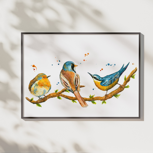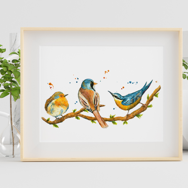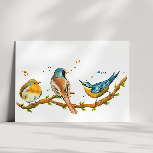 This print of my original watercolour painting was inspired by the walks I take in the nearby forest. It will bring you the feeling of going out on a walk. On the left is a European robin, in the middle, a bearded reedling and on the right a nuthatch.