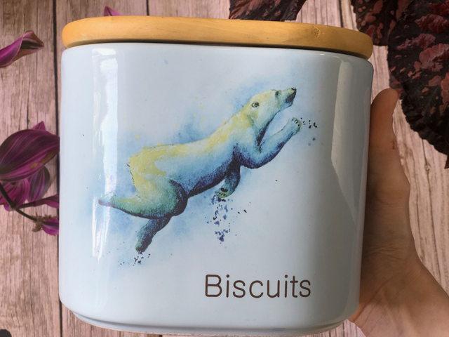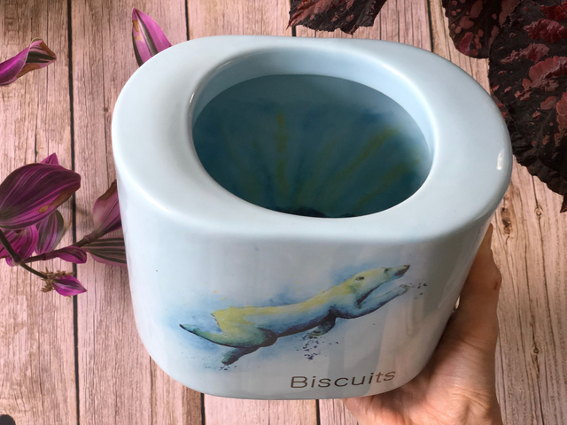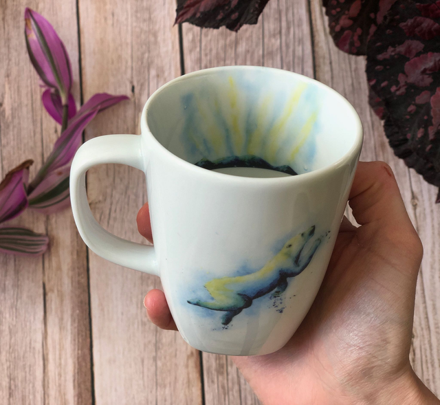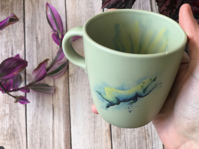 I upcycled these pieces using the watercolour painting I made of this swimming blue and green polar bear and the northern lights using ceramic decals. I then fired the pieces so the painting bonds with the glaze of the ceramic, which makes them safe to use with food or drinks. They are also dishwasher and microwave safe.