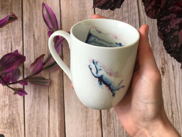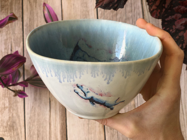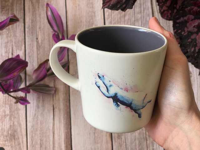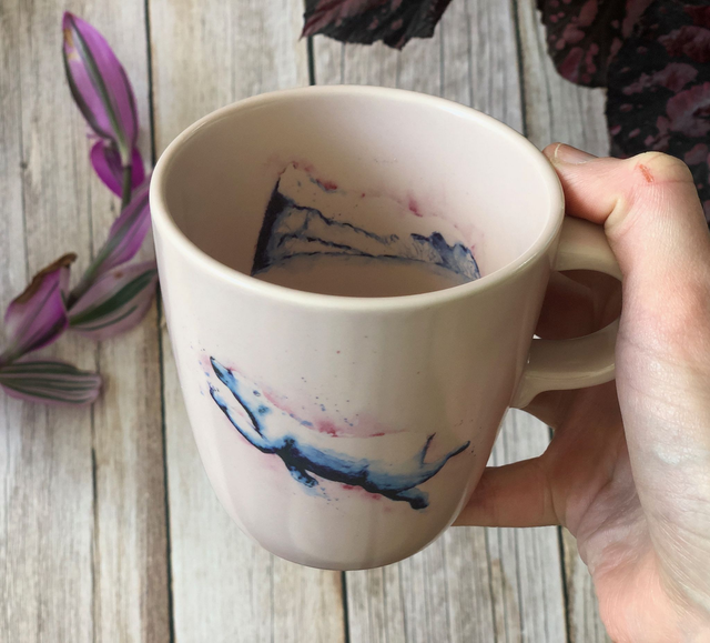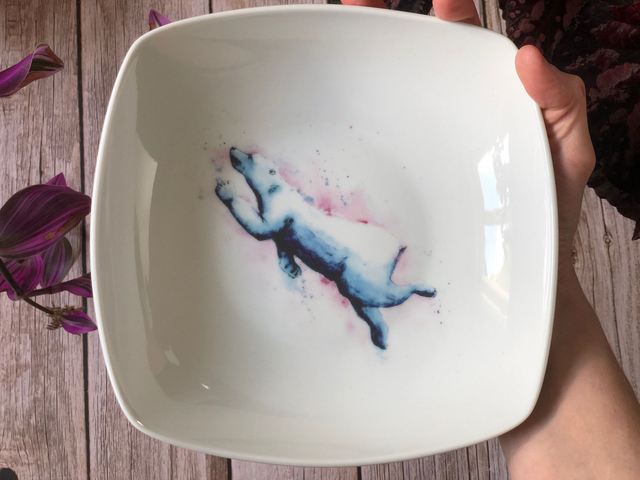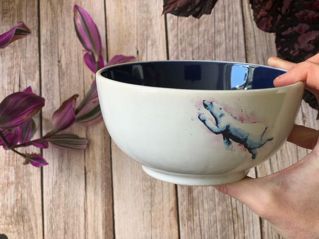 I upcycled these pieces using the watercolour painting I made of this swimming blue and pink polar bear using ceramic decals. I then fired the pieces so the painting bonds with the glaze of the ceramic, which makes them safe to use with food or drinks. They are also dishwasher and microwave safe.