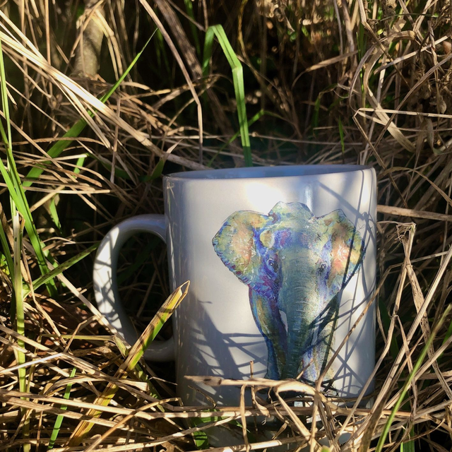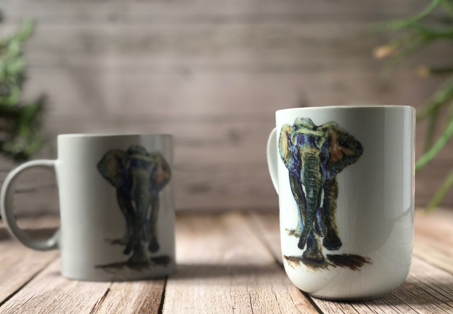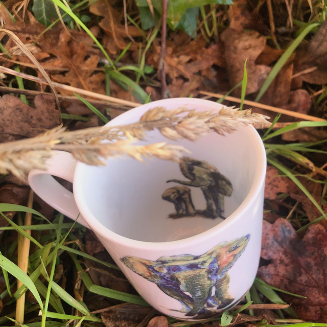 Using ceramic decals to transfer my painting, I designed it the way that when you drink your tea or coffee or whatever drink you have the feeling that the elephant and her baby inside the mug are walking behind the elephant on the foreground.