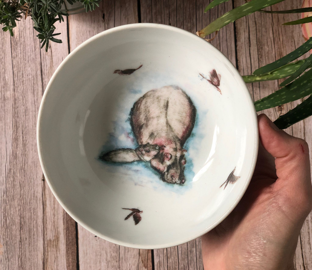 I upcycled this bowl using a watercolour painting I made of an hippo and her baby. Once fired in a kiln, the painting bonds with the glaze of the bowl. That’s why it is safe to use for food and drinks. It's now safe to use it with food and drink. It is also microwave and dishwasher safe.