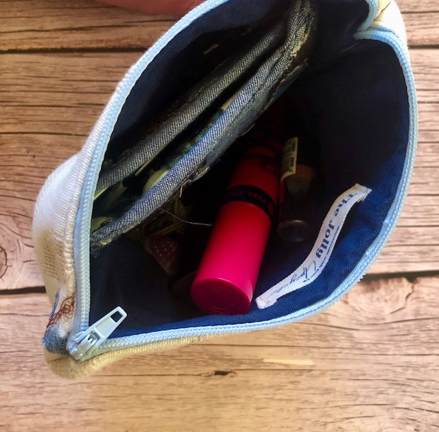 This pouch was inspired by the walks I take in the nearby forest. I hand painted the robin and sewed it onto a cream fabric. I then added leaves with denim and embroidered the main branch where the birds are sitting. I then sewed all fabrics together into this pouch.