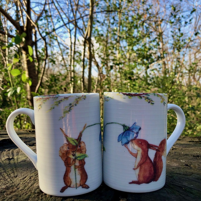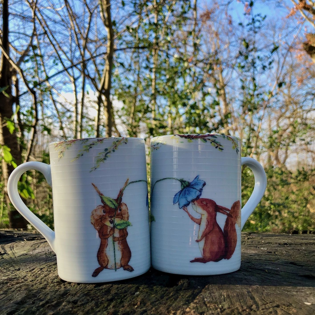 I watercolour painted these two squirrels separately but with the same flower, a blue hibiscus. So when it was time to upcycle the mugs with the ceramic decals of the paintings, I put the decals on two different mugs. I made sure that when placed side by side, the mugs would tell the story of this friendship.